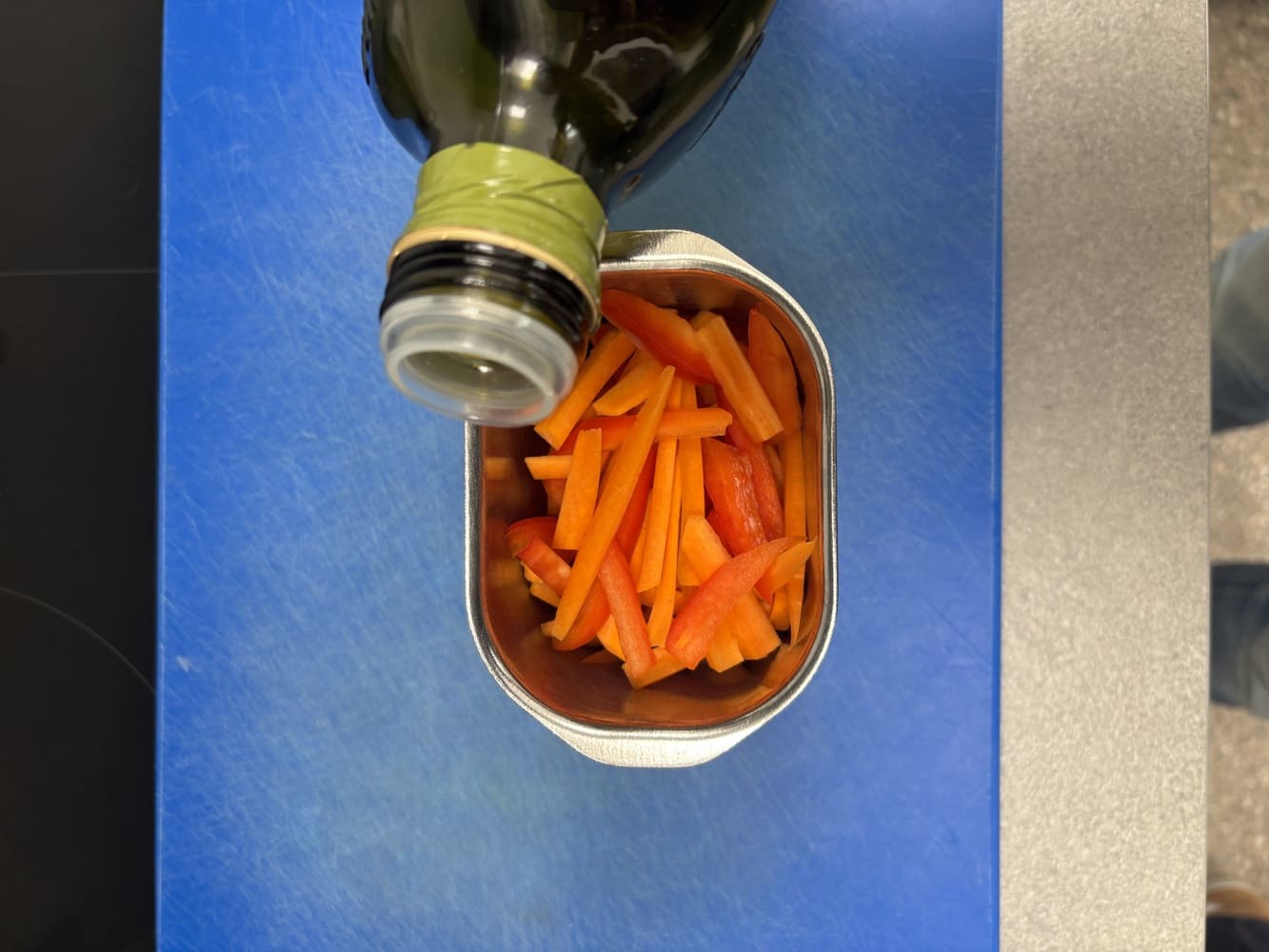 Cut the peppers and carrots into strips. Place them in the container together with extra virgin olive oil, julienned fresh garlic, and some of the fine salt.