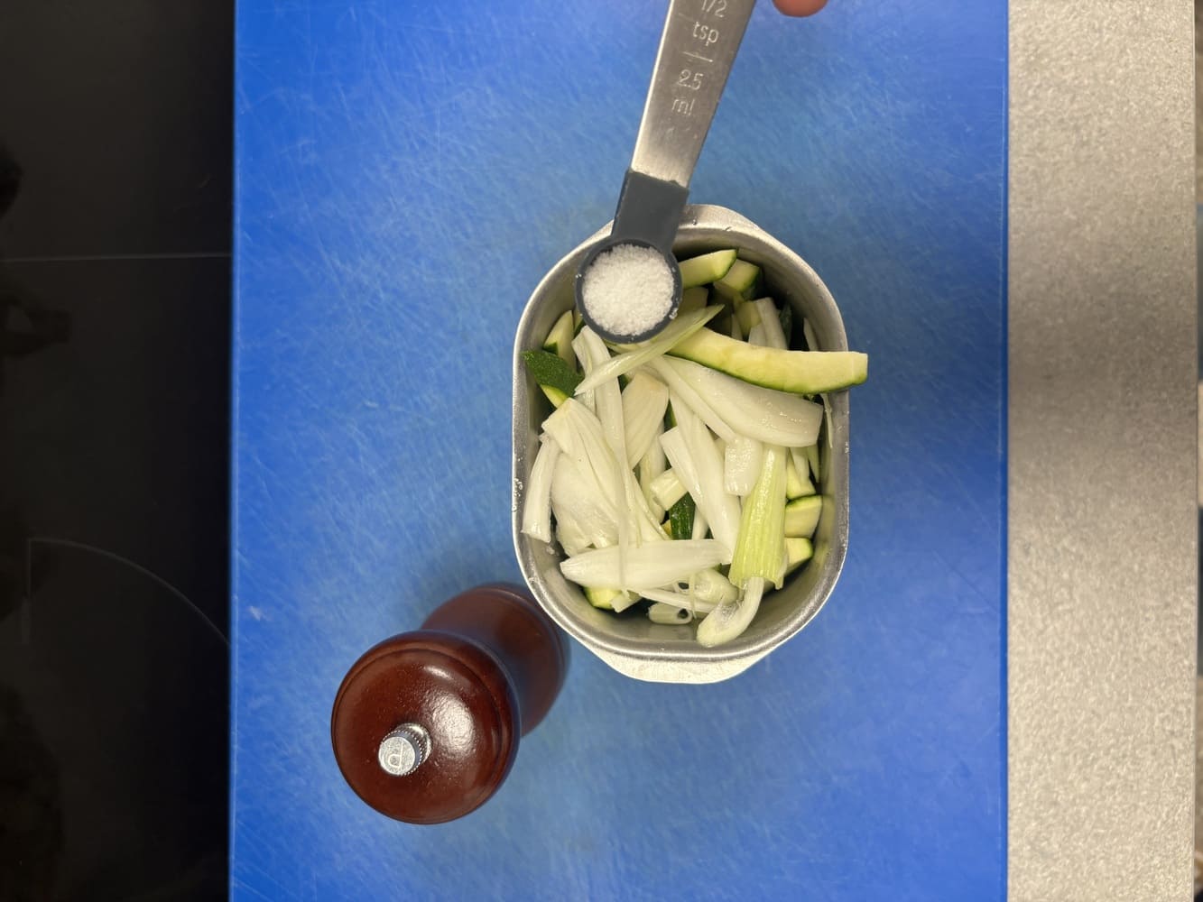 Then it adds zucchini and spring onions, which soften while maintaining their bright color.